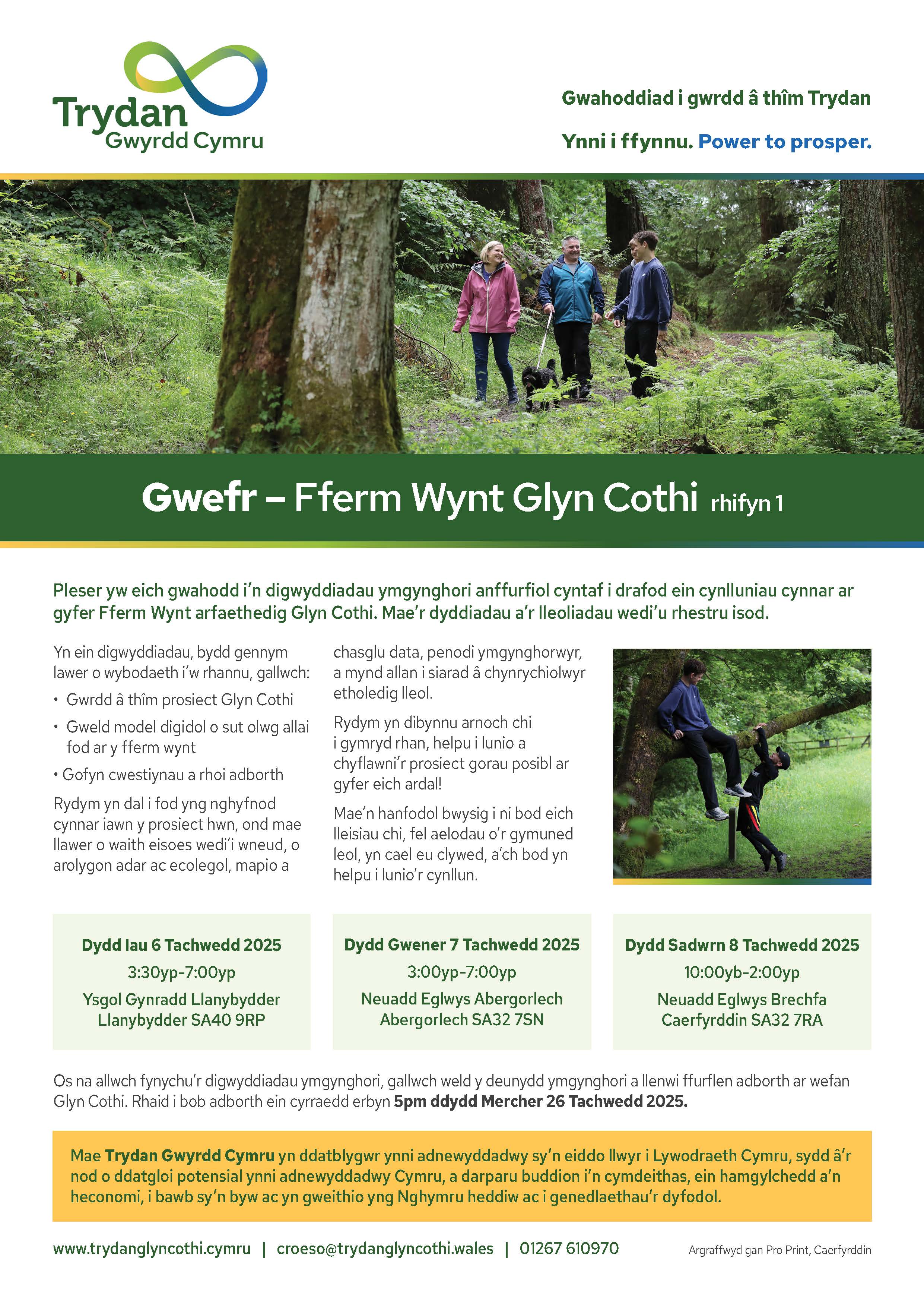 Byddwn yn mynd allan i gwrdd â phobl ac yn mynychu digwyddiadau lleol, i godi ymwybyddiaeth o’r prosiect a chlywed gan bobl sut y gallwn wneud hwn y prosiect gorau i’r gymuned leol ac i Gymru.