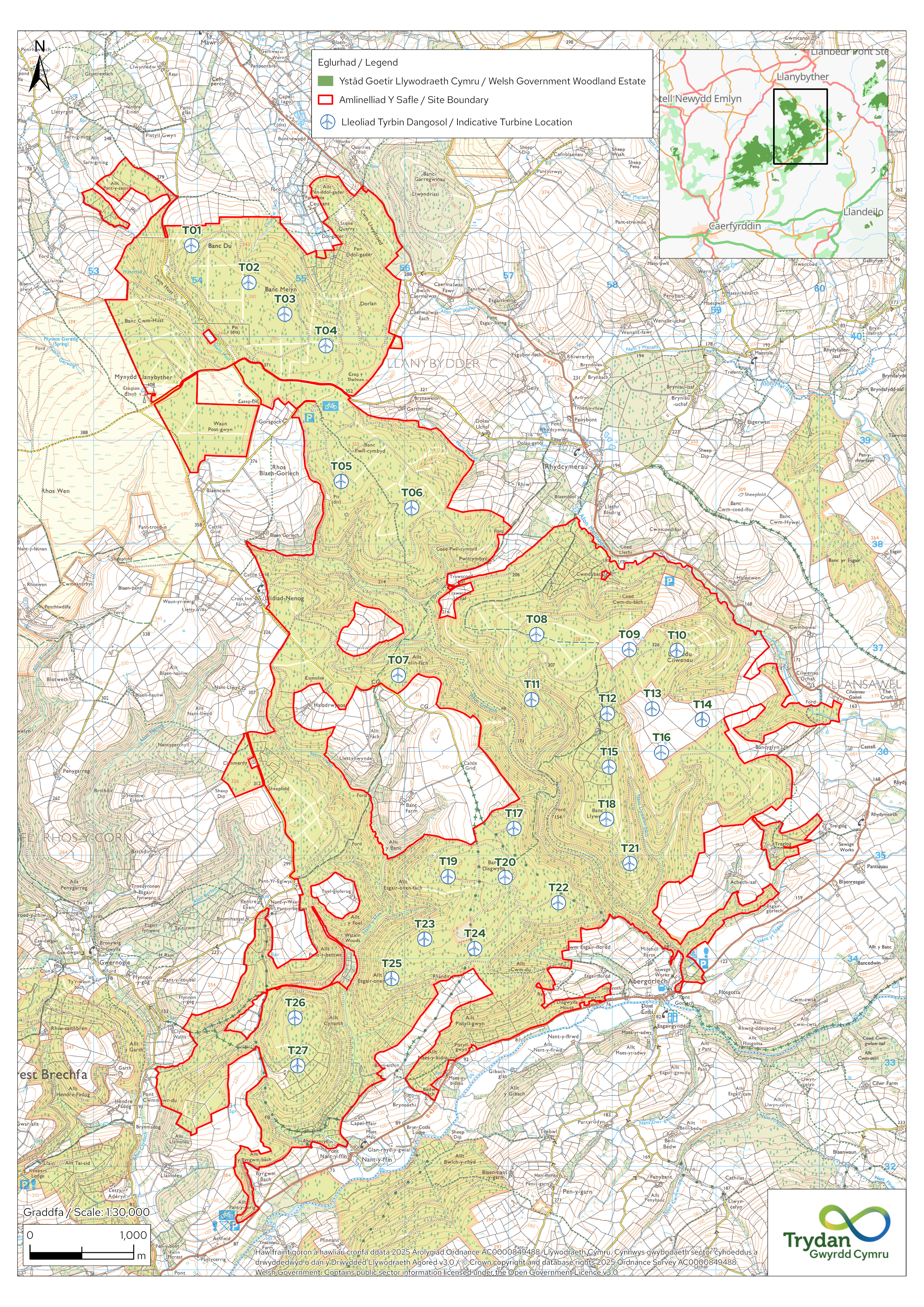 Trydan Gwyrdd Cymru (Trydan) yw datblygwr ynni adnewyddadwy Cymru sy'n eiddo llwyr i Lywodraeth Cymru. Rydym yn ymchwilio i'r potensial ar gyfer ffermydd gwynt newydd gyda storfa ynni batri o fewn nifer o flociau Ystad Goetir Llywodraeth Cymru, gan gynnwys Coedwig Brechfa. Wedi'i lleoli tua 20km i'r gogledd-ddwyrain o Gaerfyrddin, mae Coedwig Brechfa o fewn Cyngor Sir Gaerfyrddin.